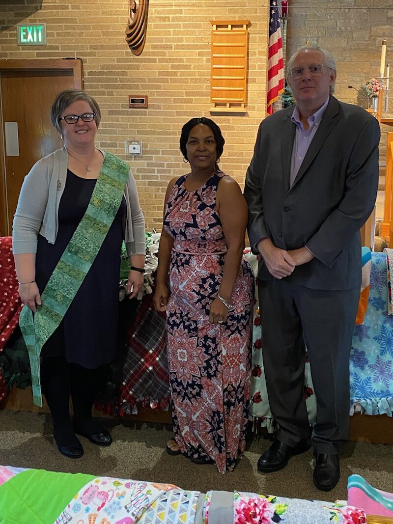 Brian Swayne and Dierdre Griffin pictured with Carrie Sovola who donated several prayer quilts to the ladies of Lydia House